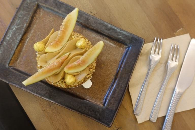 「羽舞」有很浮誇的外型,它是無花果與臻果搭配的甜塔,所以塔上飛舞著的,正是新鮮的無花果肉,果肉就不偏不倚的停放在臻果奶油上,奶油上還鑲著鍍金粉的臻果,臻果奶油下又舖了碎果仁,光是外層的部份就有那麼豐富美妙的層次,害我不專業的切了就往嘴裡送,壓根沒想到要拍斷面秀,想起時為時已晚…
