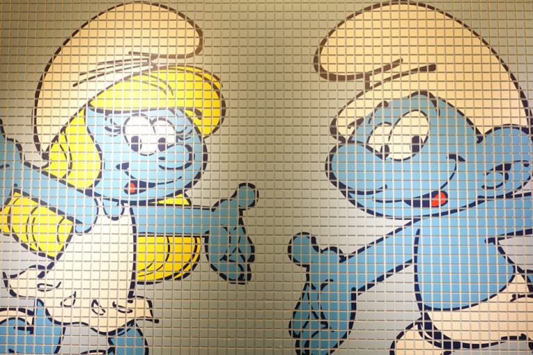 不只是立體的大公仔,展場牆面滿滿都是藍色小精靈。